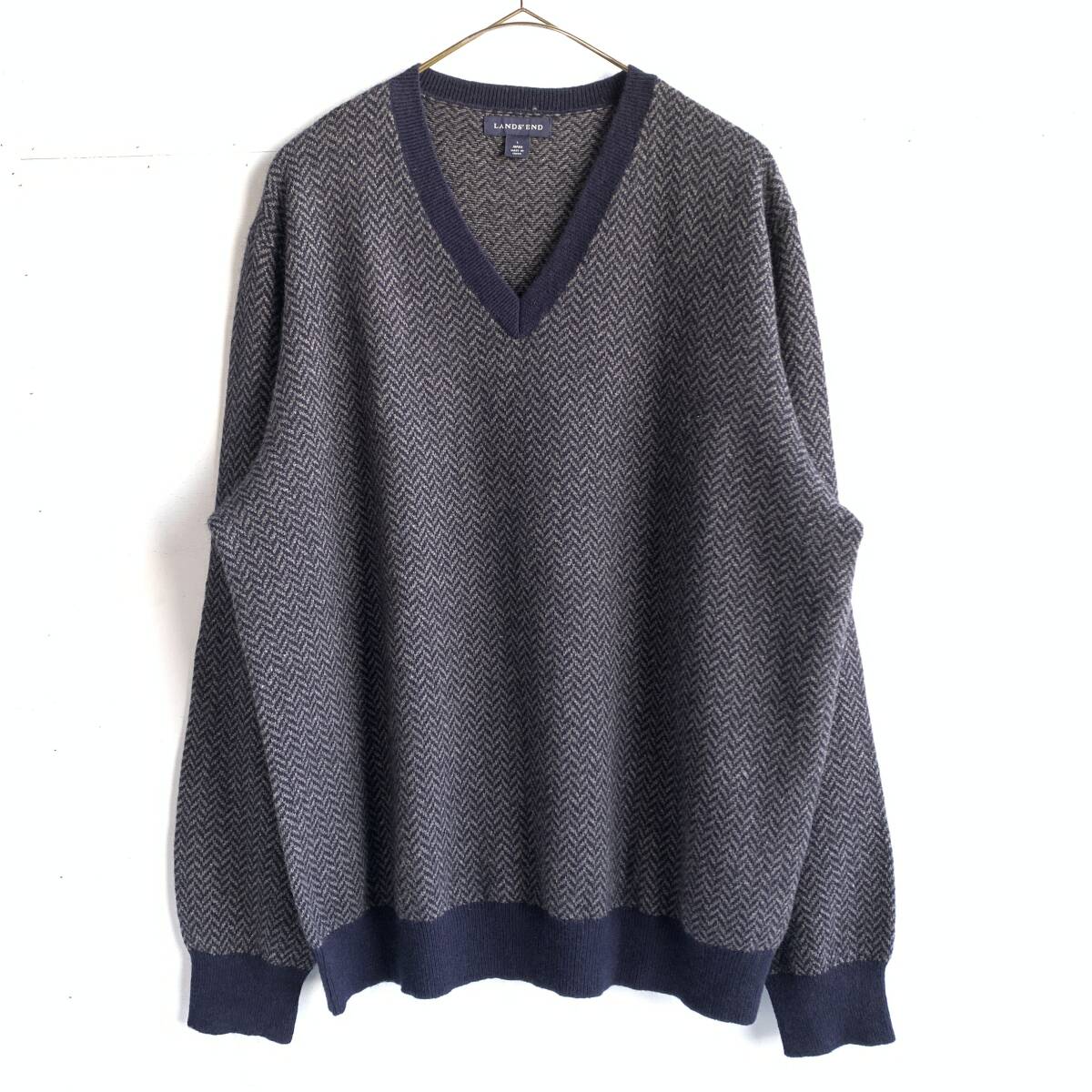 > ☆最高級 LANDS' END ランズエンド CASHMERE ヘリンボーン Vネックカシミヤニットセーター ネイビー系 L【レターパックプラス郵送可】J