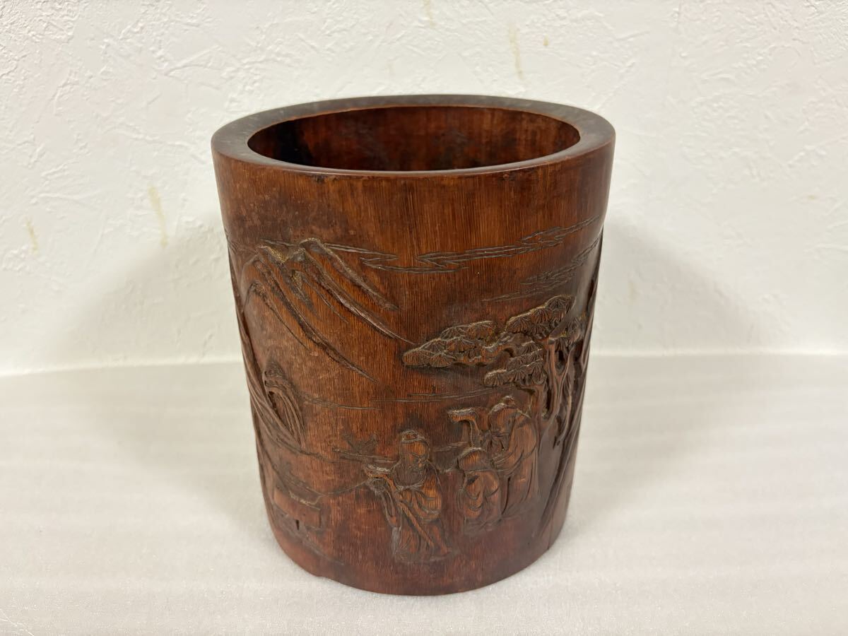 - 中国古玩 竹製 筆筒 彫刻 山水人物図 文房具 レトロ アンティーク 中国美術 時代物