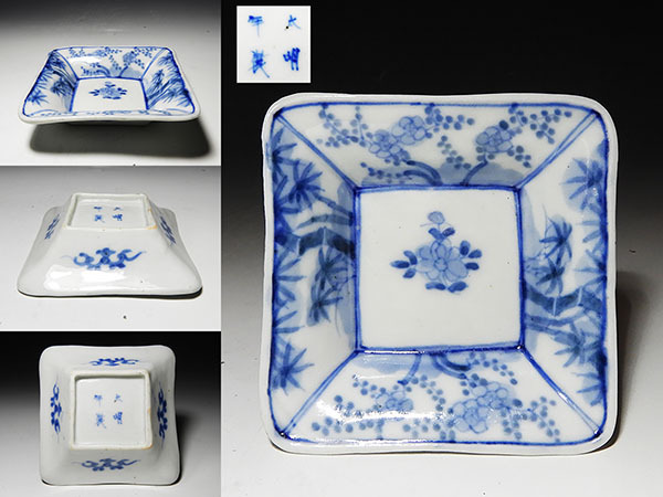 - 【桃】清朝期染付竹梅花の図四方皿 大明年製