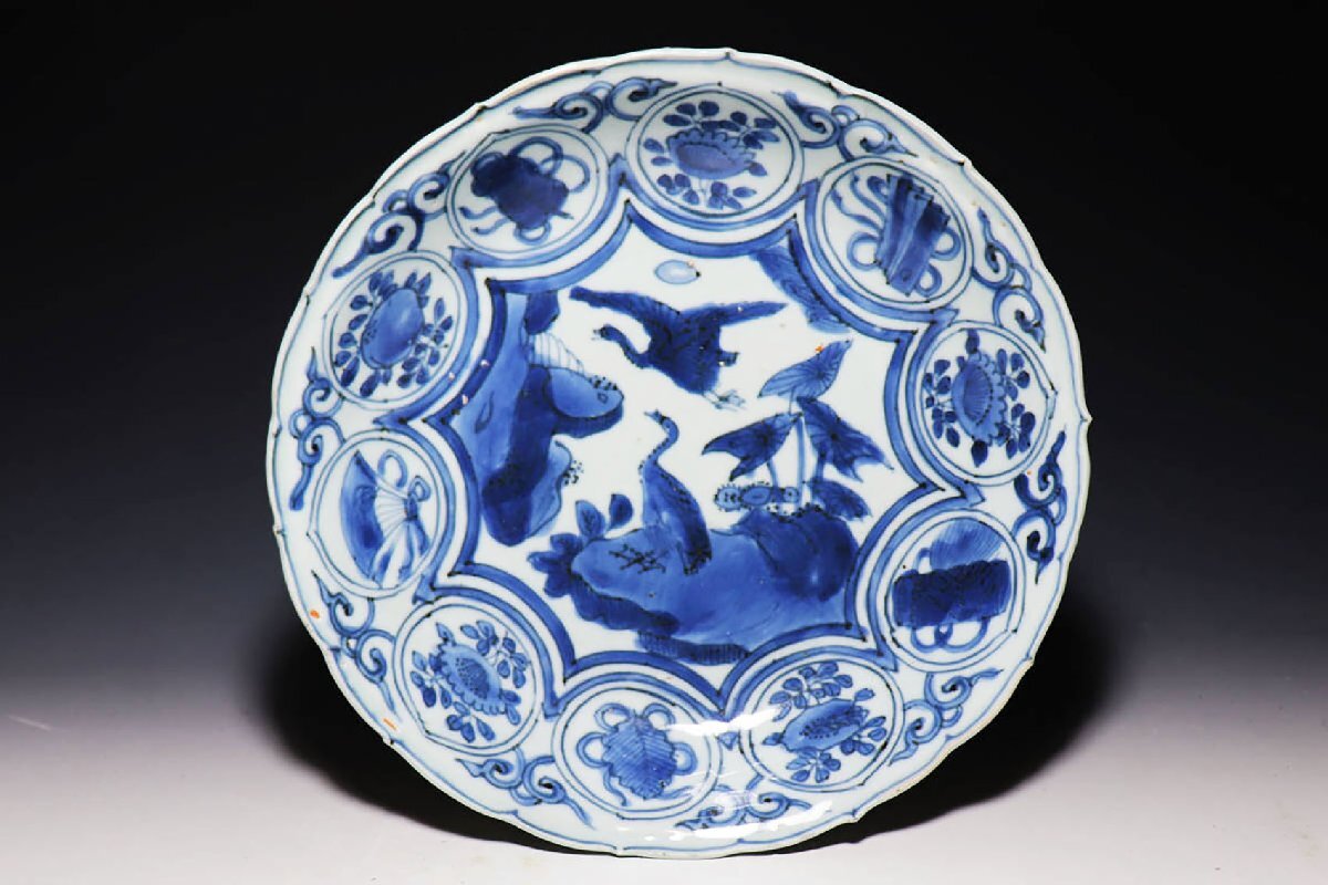 - 【桃】古染付:明末清初染付水辺の夫婦鴨図芙蓉手七寸皿
