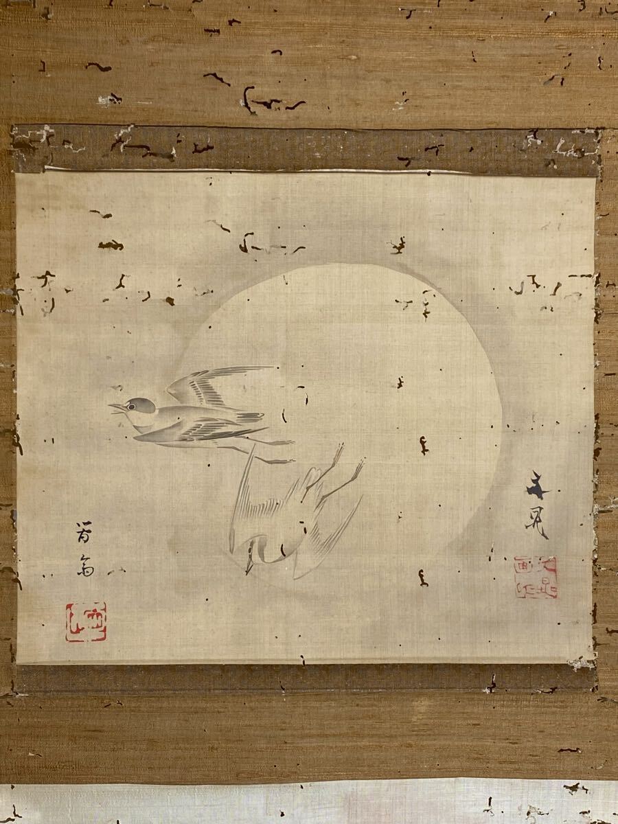 > 【模写】谷文晁「月に鳥」絹本 紙箱 渡辺玄対師事 日本画 茶掛 茶道具 古美術 中国 掛軸 掛け軸 人が書いたもの《魚亀》