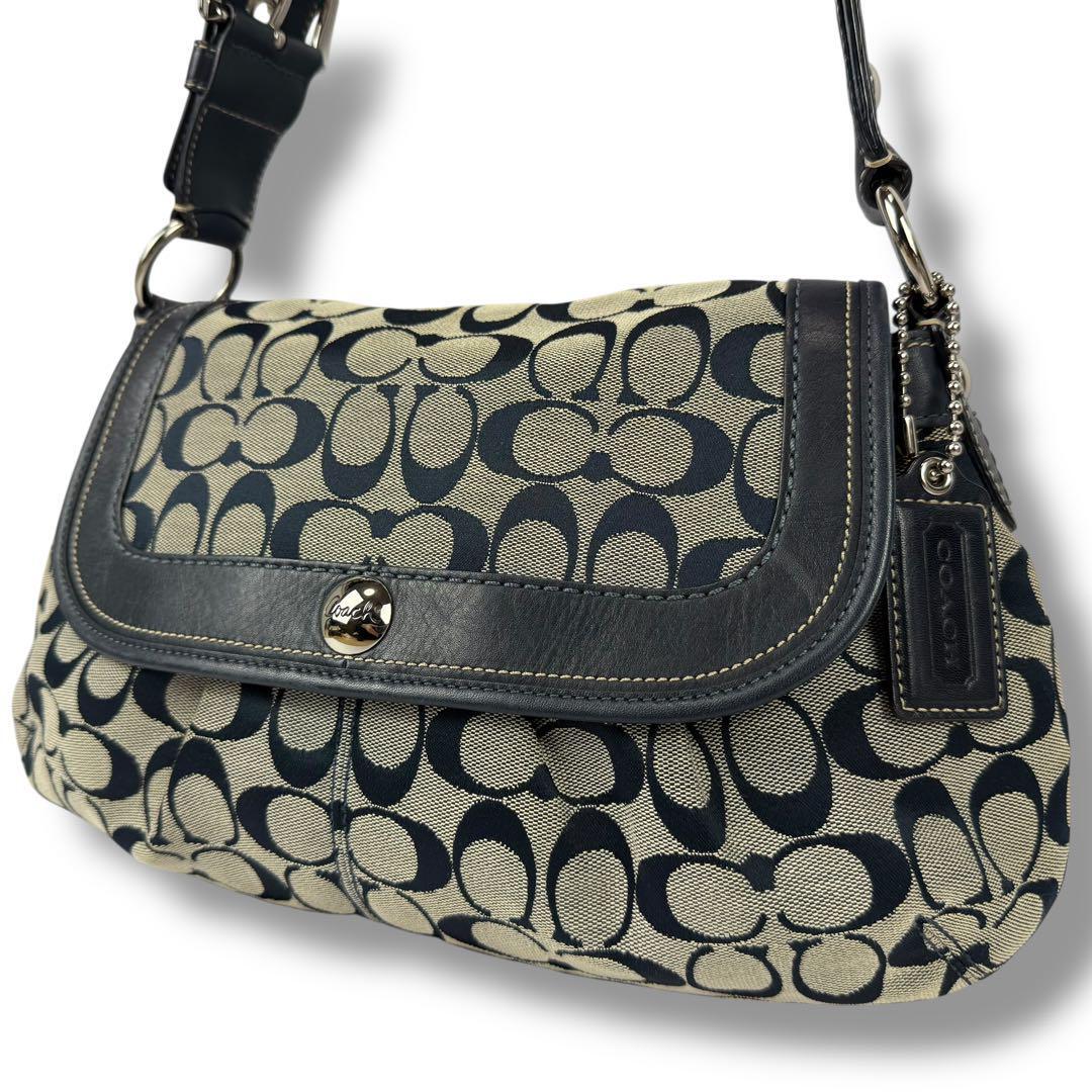 - 【美品】COACH コーチ ワンショルダー ハンド バッグ 肩掛け カバン メタルロゴ シグネチャー キャンバス レザー グレー ネイビー 13739