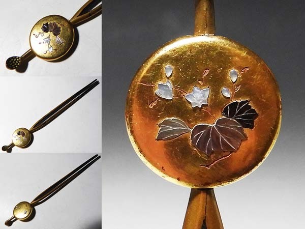 - 【桃】アンティーク髪飾り:蒔絵貝螺鈿花蝶簪