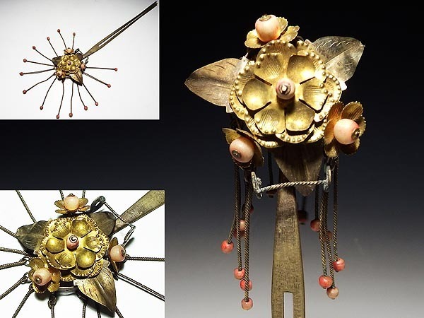 - 【桃】アンティーク髪飾り:金工銀地金鍍金本珊瑚花車ビラ簪