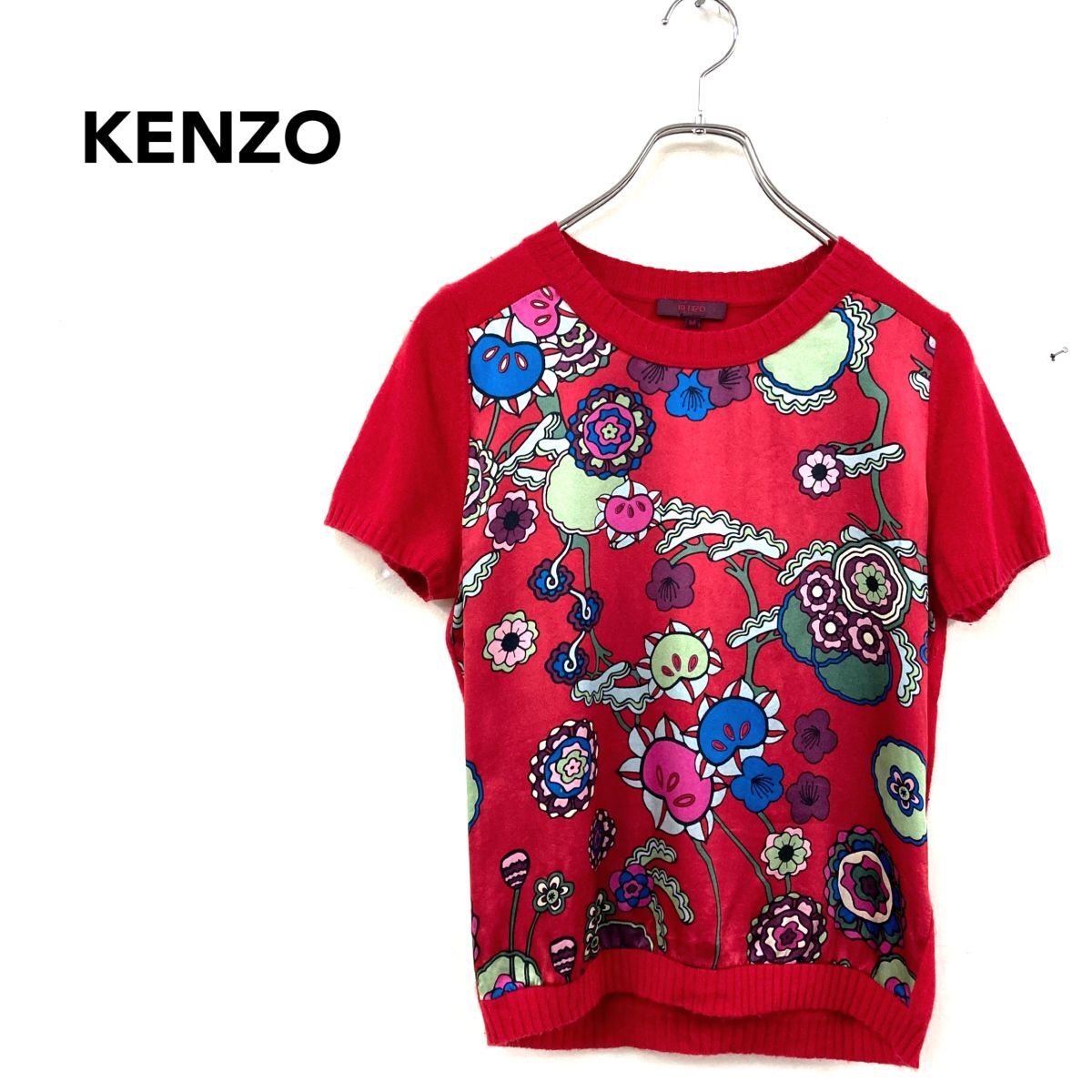> 2O1557-W◆KENZO ケンゾー 半袖ニット プルオーバー シルク 異素材組み合わせ カジュアル レディース◆size:M レッド 赤 レーヨン 他