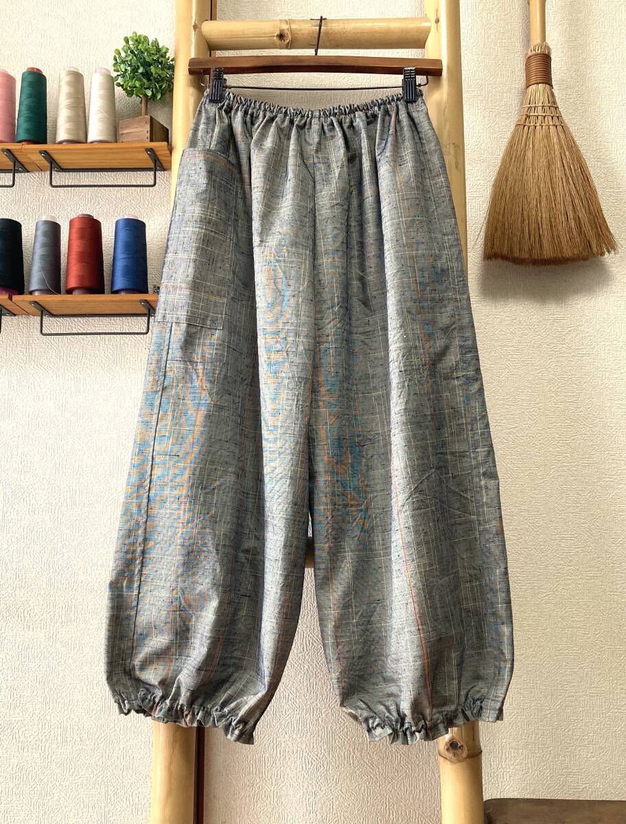 - 鎌倉まるか堂 着物リメイク 紬 絹鼠色に乱格子のもんぺ風 ●絹 ●ゆったりまるっこいシルエット M~L●裾ふわパンツ●洗濯OK