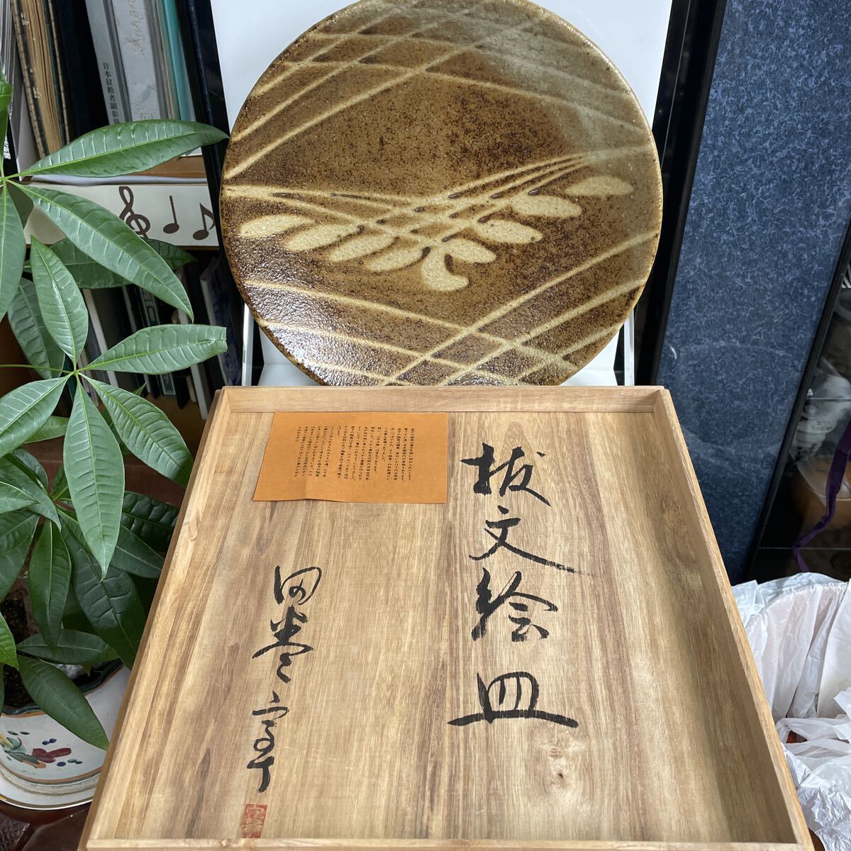 - 益子焼/文皿/Φ29.5cm/共箱/骨董/大皿/盛皿/飾り皿/絵皿/額皿