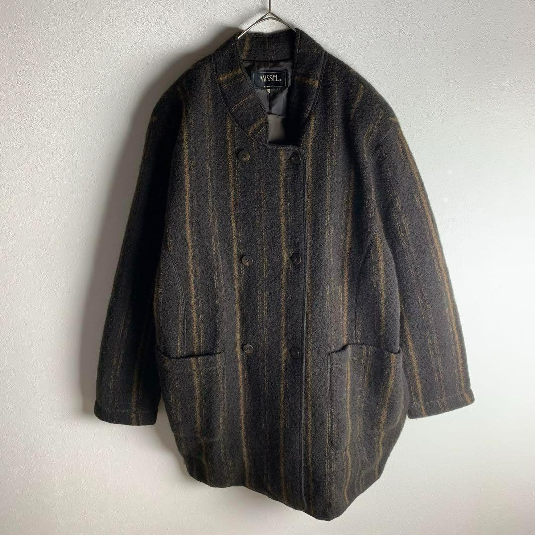 - ジャケット バンドカラー アウター コート ダブルボタン ダブルブレスト ストライプ ダークブラウン ダブルポケット レトロ ユニセックス