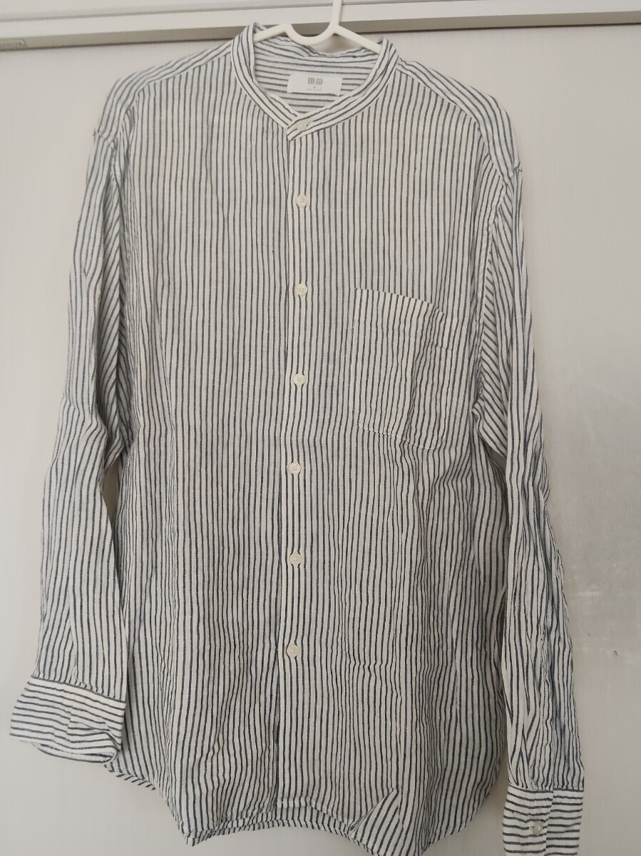 - ユニクロ プレミアムリネン スタンドカラー ストライプシャツ 長袖 ブルー 綿100% サイズM ¥2,990購入