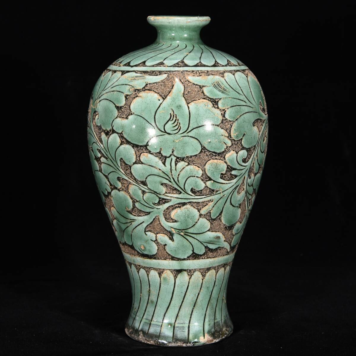 > *珍品旧蔵* 宋 磁州窯 綠釉刻花卉紋 梅瓶 陶芸 古陶磁器 中国磁器 極細工 中国古玩 骨董品 古美味 H410