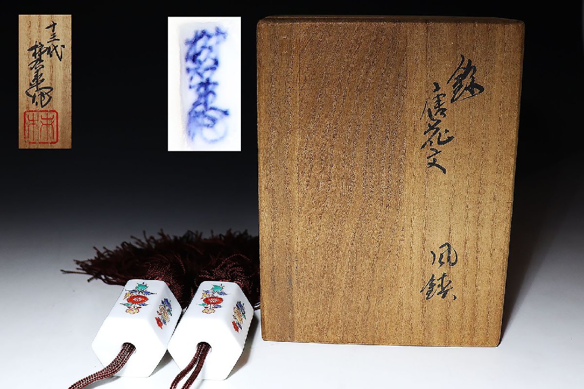 - 【桃】掛け軸風鎮:十三代酒井田柿右衛門色絵花紋様図六角面取風鎮