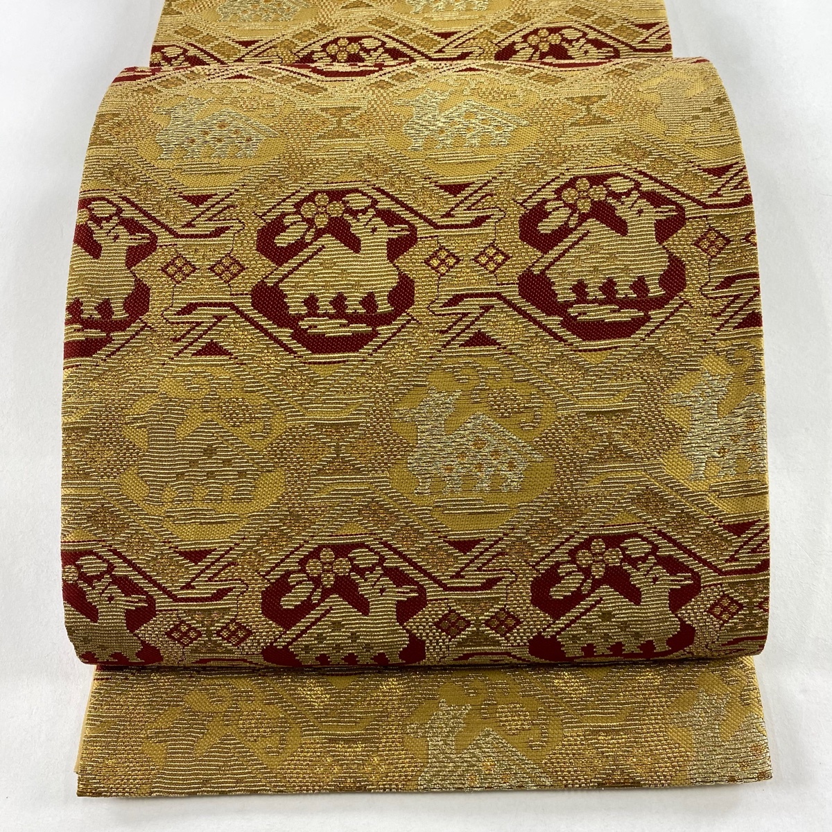 - 【美品】 袋帯 名品 有栖川文 金糸 箔 山吹茶色 六通 正絹 【中古】