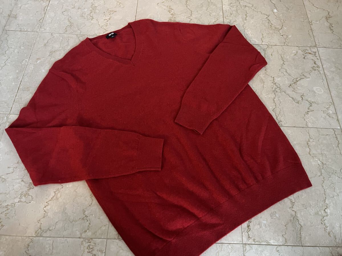 > ユニクロ★メンズ 赤 レッド カシミヤ100% Vネック セーター XLサイズ USED♪c