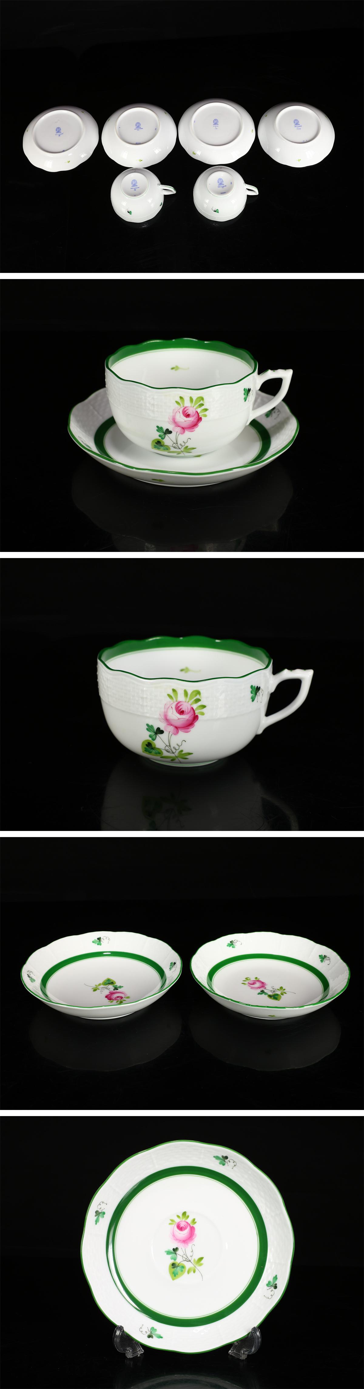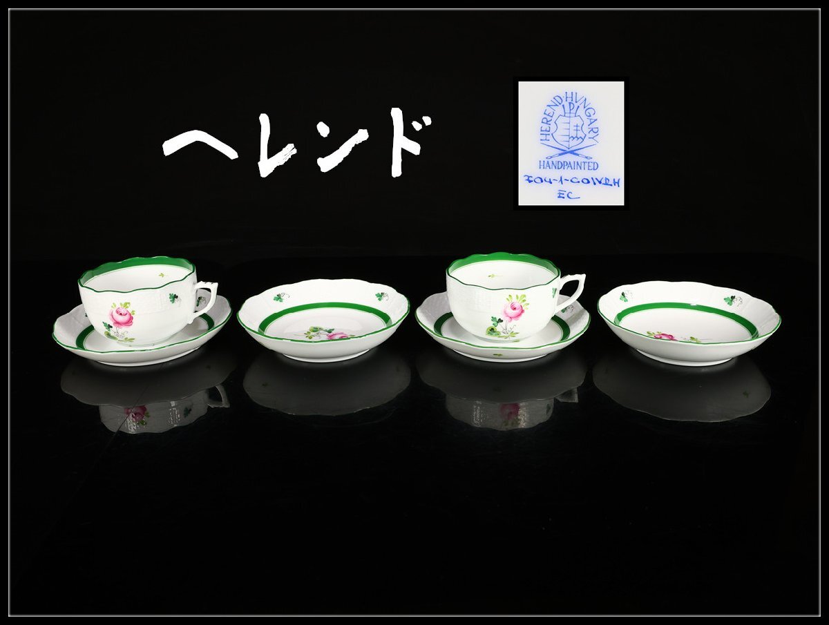 > 【吉】CN300 Herend 【ヘレンド】 緑釉赤薔薇文 カップ&ソーサー プレート 2組 6点セット/美品!