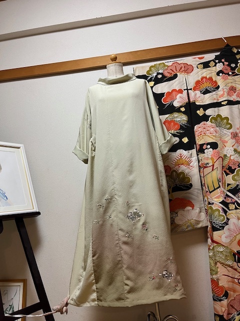 - 5882/美品~丹後縮緬訪問着/ぼかしにわらべやお花の刺繍で前はサイド、後ろはW切替の2WAYワンピース♪着物リメイク♪入学式~結婚式~