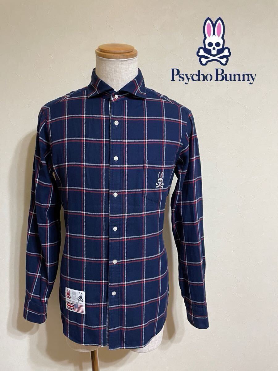 > 【良品】 PsychoBunny サイコバニー ビッグロゴ タータンチェック柄 シャツ トップス サイズL 長袖 ネイビー 刺繍 スカル兎