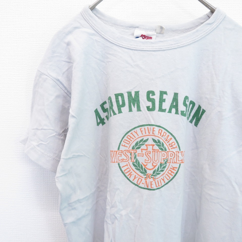 【ブランド】フォーティーファイブアールピーエム 45RPM【アイテム】Tシャツ【表記サイズ】1【平置き実寸】肩幅:約 41cm袖丈:約 13.5cm着丈:約 58cm身幅:約 45cm【状態】目立った傷汚れなし【備考】-【色】薄いグレー系【素材】画像をご参照くださいキーワード/アクイール/古着/used/ビンテージ/ヴィンテージ/レトロ/ロゴT/アメカジ