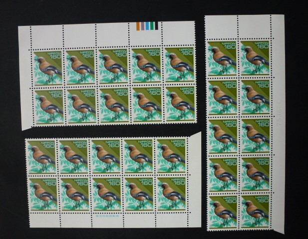 - 国立銘版より 160円 カケス カラーマーク上と銘版と計数 各10枚ブロック 計30枚 未使用 完美品 MB-55-3s