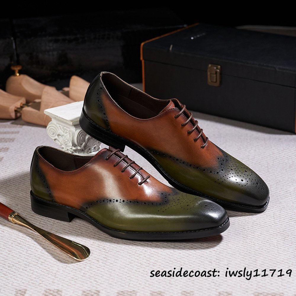 - 最高級★定価10万超 ビジネスシューズ 本革 メンズ 切替 職人手作り 彫り 牛革 レザーシューズ 紳士靴 革靴 フォーマル グリーン 27.0cm