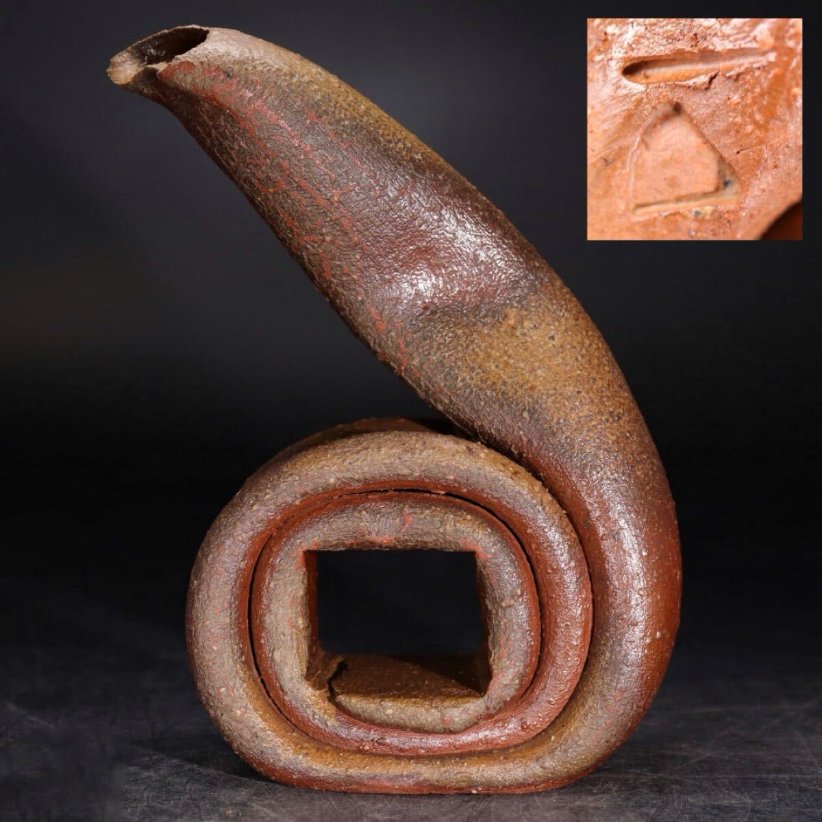 > 隠崎隆一 作 備前 渦巻 花瓶 / 備前焼 細工物 窯変 花器 壺 煎茶飾 手捻り 手造 .G2814
