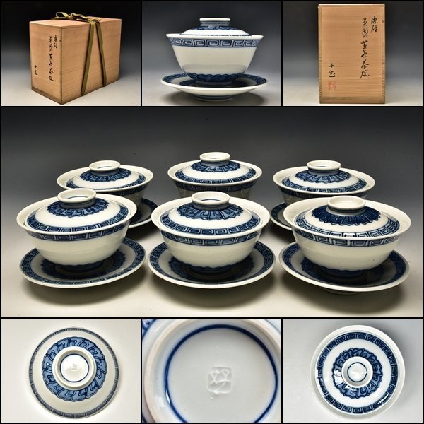 - SP6393 染付 蓋茶碗 茶碗 蓋碗 六客 共箱