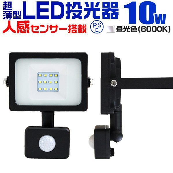 > LED ライト 投光器 人感センサー付 薄型 10W 昼光色 6500K 広角 駐車場照明 100W相当 AC100V対応 防犯に 照明 ライト 3mコード付 PSE