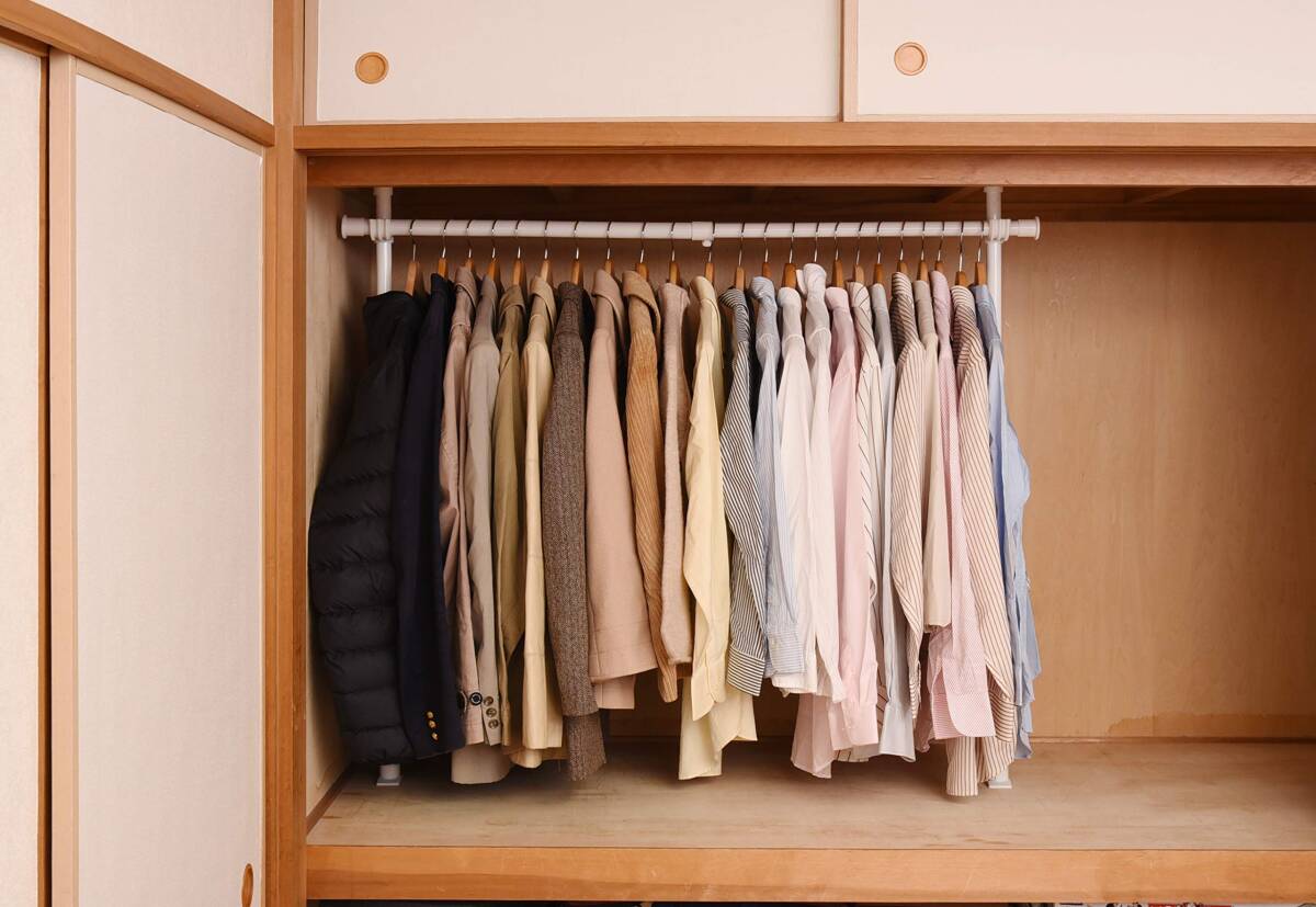 > 山善 突っ張り ハンガーラック 幅73-120×奥行9×高さ80-124cm 押入れ たっぷり収納 たて・よこ伸縮 ひっかけ棒付属 かんたん設置