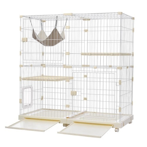 - 猫 ケージ キャットケージ 2段 幅広設計 自由組み合わせ 猫ドア付き ハンモック付き 大型 猫ゲージ 高級感 おしゃれ スチール ベー KU986