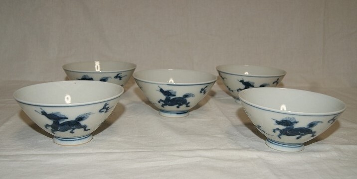 - B141★中国製・時代物・染付図柄が面白い・茶器5客セット傷なし*口幅約5.5cm