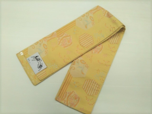 - 洗える 半幅帯 リバーシブル 細帯 薄黄色 亀甲 小花 新品 213