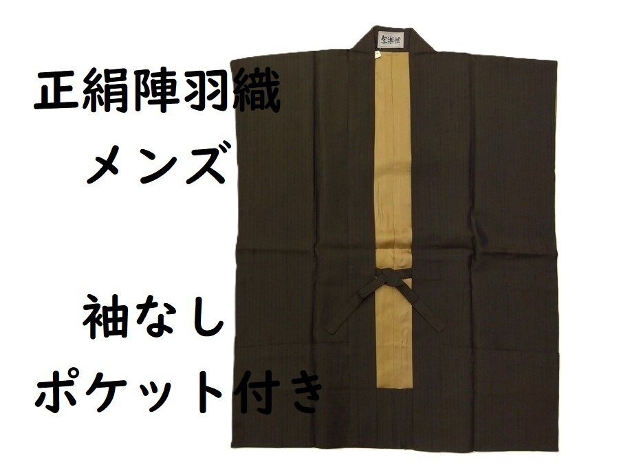 - 陣羽織 正絹 メンズ 袖なし ポケット付き 総裏付 焦げ茶色 ダークブラウン M 858