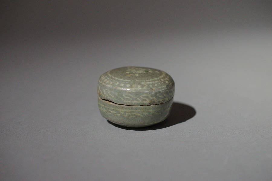 高麗青磁の小ぶりな合子(香合)です。おおらかで素朴な象嵌文様。てのひらにちょこんと乗る愛らしさが見飽きません。箱には三島と書かれておりますが、ごらんのように、高麗青磁と呼ぶよりない時代の作品になります。