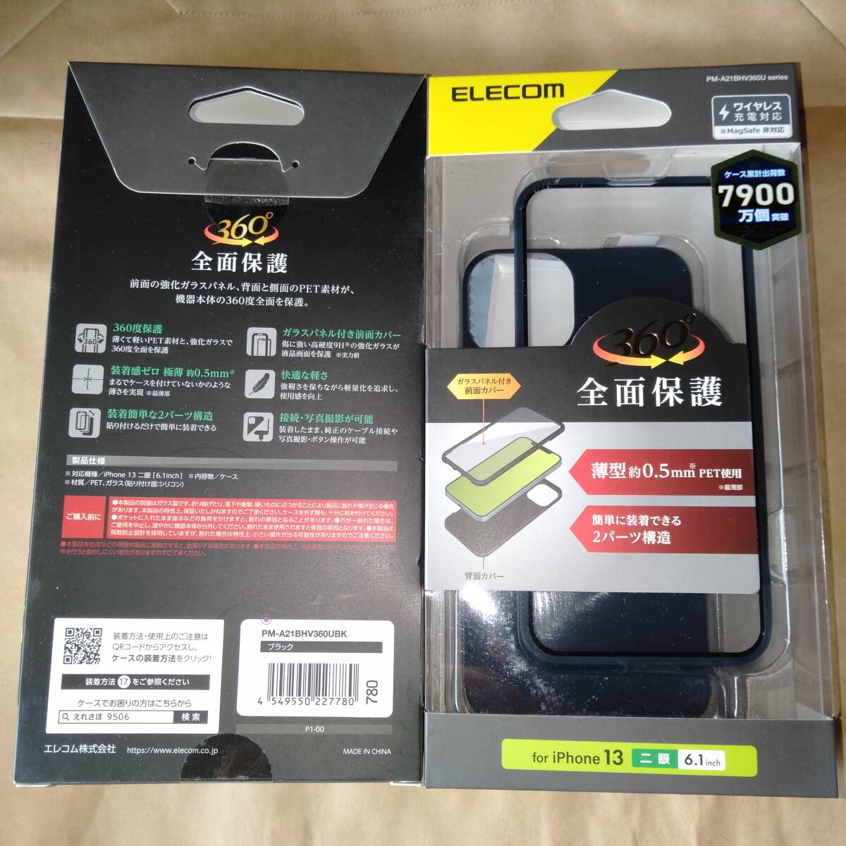 > ELECOM iPhone 13 iPhone 14 ハイブリッドケース 360度保護 薄型 ブラック 前面の強化ガラスと背面側面のPETで端末360度全面保護 〒290~