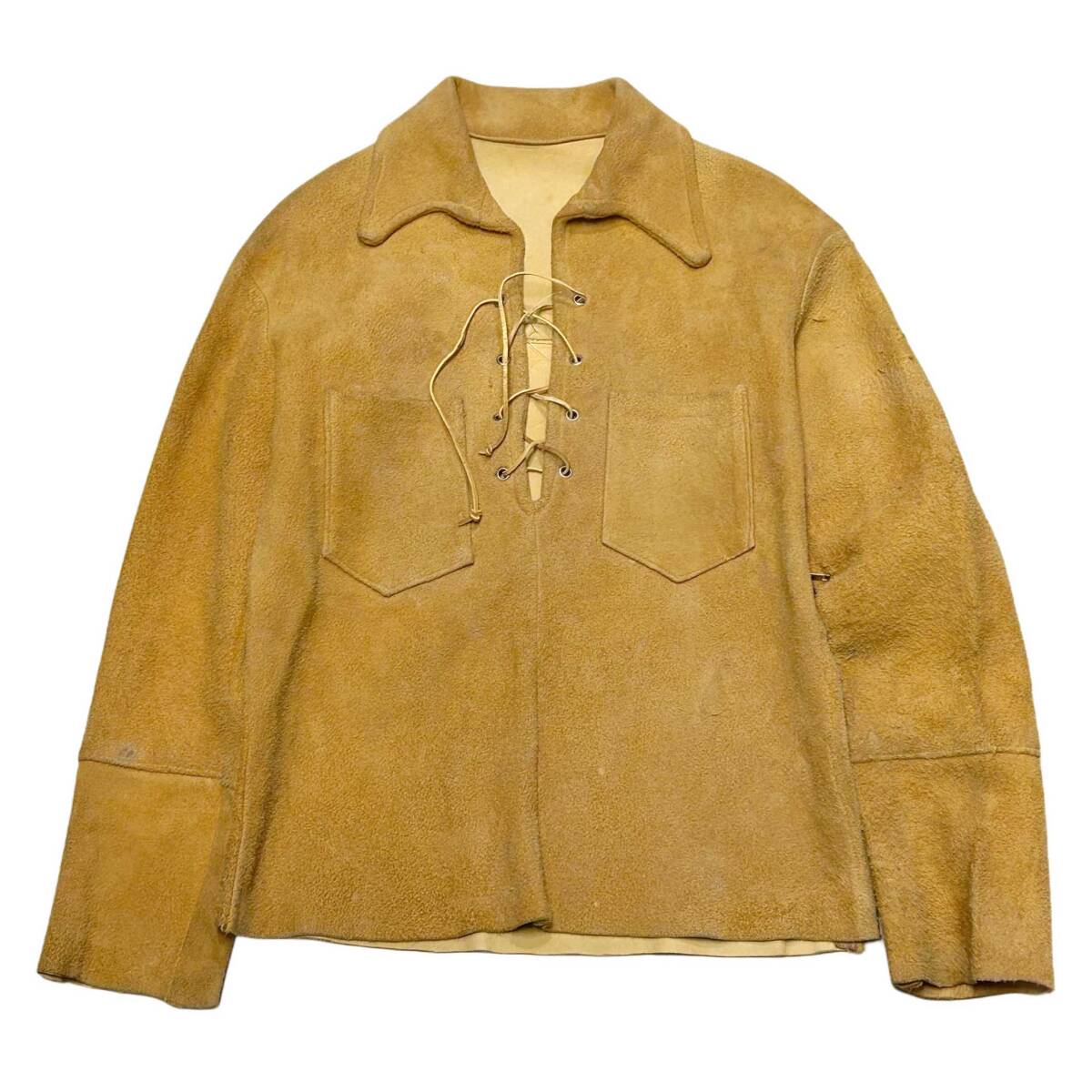 > 希少【60s 70s ビンテージ ディアスキン レースアップ プルオーバーシャツ COATS&CLARK 】50s 鹿革 ヒッピー クラフト バイカー