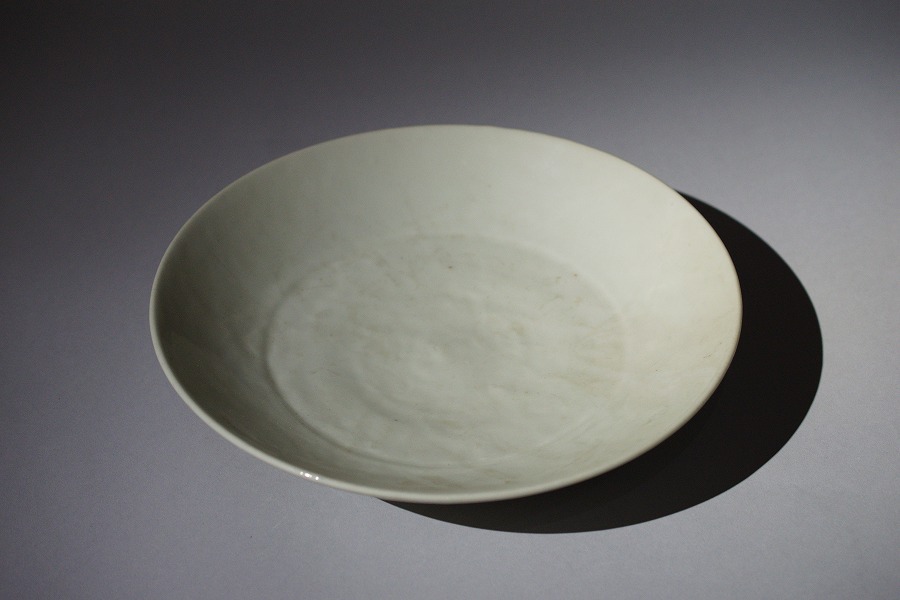 珍しい白呉須の大皿です。明末の章州窯(正確にはさんずいへんに章)の作品です。大皿といっても26センチほどで、使い勝手のよいといえる寸法。絵付けがないぶん、どんな料理を盛っても引き立つでしょう。古渡り伝世ですが傷気もなく、堅牢な呉須なので実用性抜群です。また、ひっくり返すと高台の荒々しい景色も楽しめます。江戸期の黒い桐箱に収まりますが、経年で痛んでおりますので、おまけ程度にお考えください。