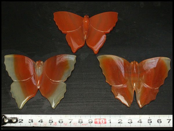 - 【銀閣】中国美術 赤 瑪瑙 刻 蝶 飾り 三件 旧家蔵出 送料無料(A287)