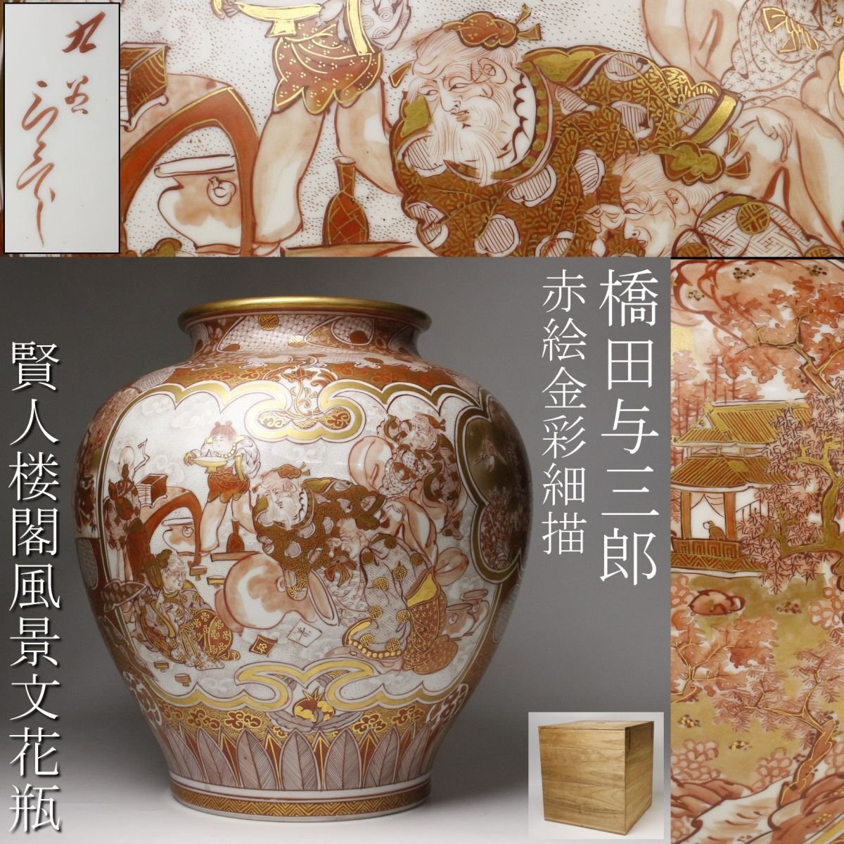 > 【LIG】九谷焼 橋田与三郎 赤絵金彩 細描 賢人楼閣風景文花瓶 36㎝ 飾壷 資産家収蔵品 [.TQ]25.8