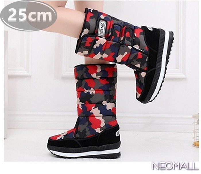 - レディース スノーシューズ 【867】 25.0cm 迷彩レッド ムートンブーツ スニーカー ウィンターブーツ 裏起毛 防水 防寒 防滑 冬用靴 綿靴