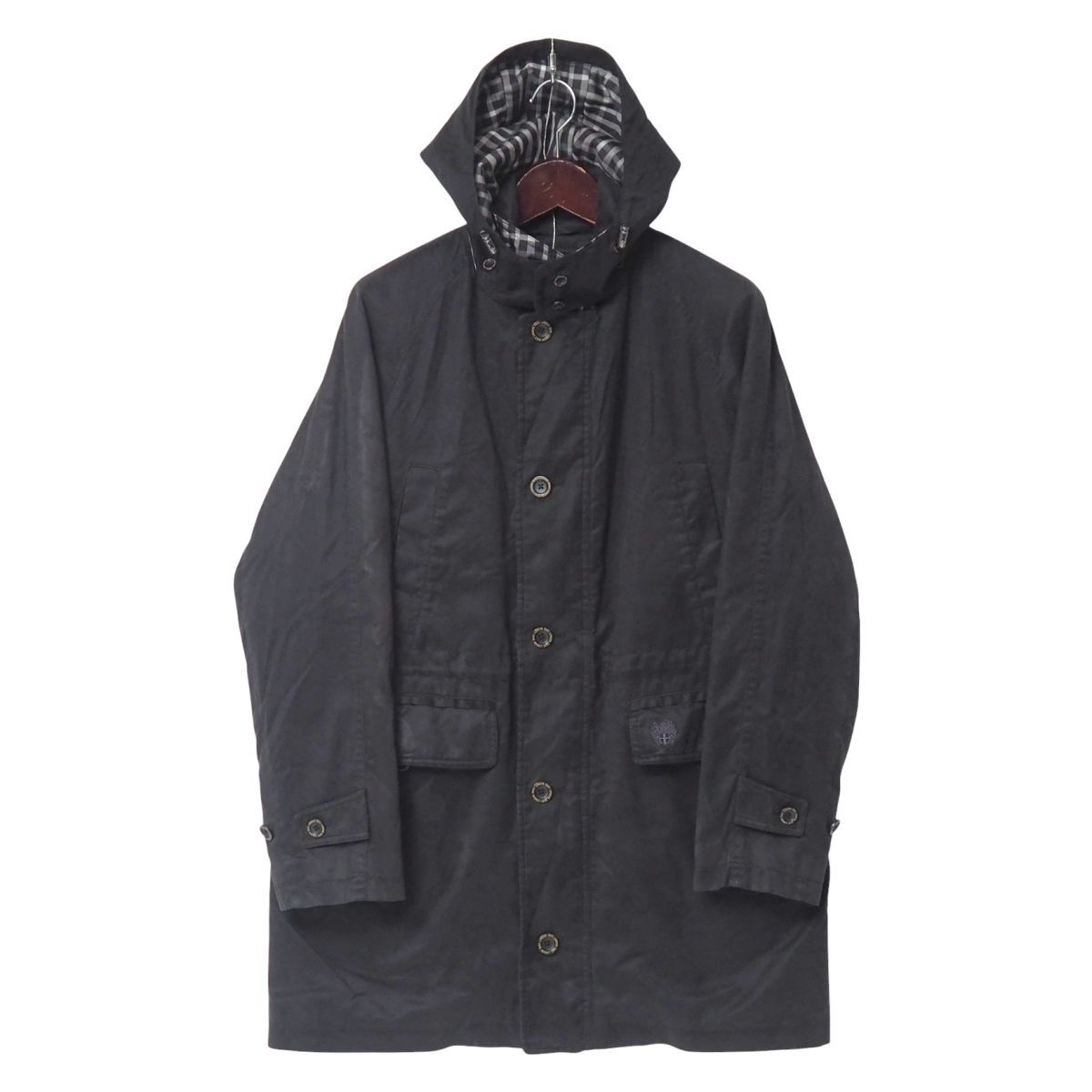 > MI1764◎DAKS ダックス フェイクスエード ダウンライナー付 中綿 ミドル丈 コート フード付 ブラック系 メンズ サイズL 裏:チェック柄