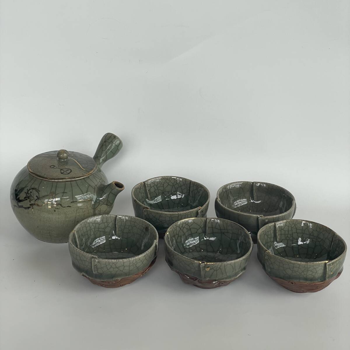 - 希少 骨董 時代物 大堀 相馬焼 急須 湯のみ 湯呑 湯飲 5客揃 金彩 美品