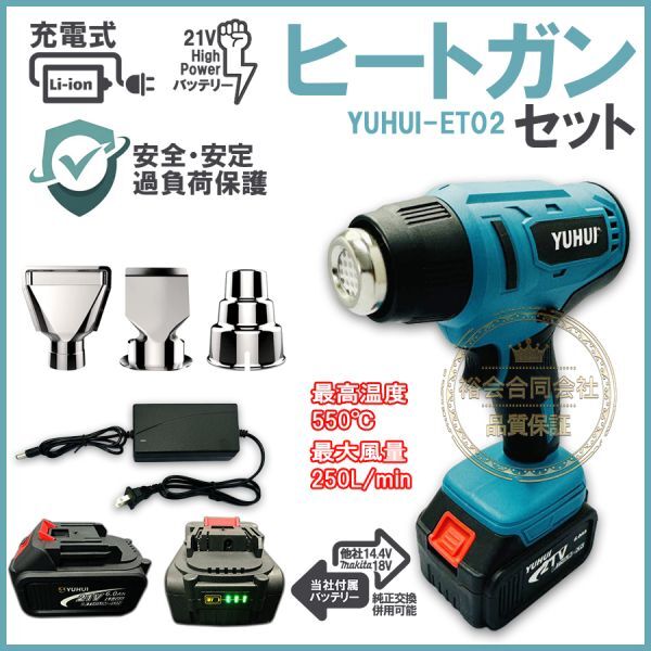 > ★送料無料・30日間保証付き★大風量 21V充電式 ヒートガン 乾燥 剥離 塗料適用バッテリー 搭載 /2種類ノズル/ バッテリー2個付き