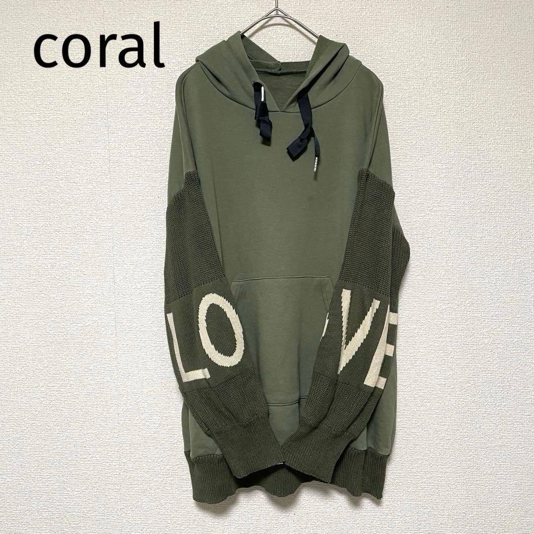 - qq308 コーラル/フーディトレーナー/切替プルオーバーパーカー/ビッグ文字