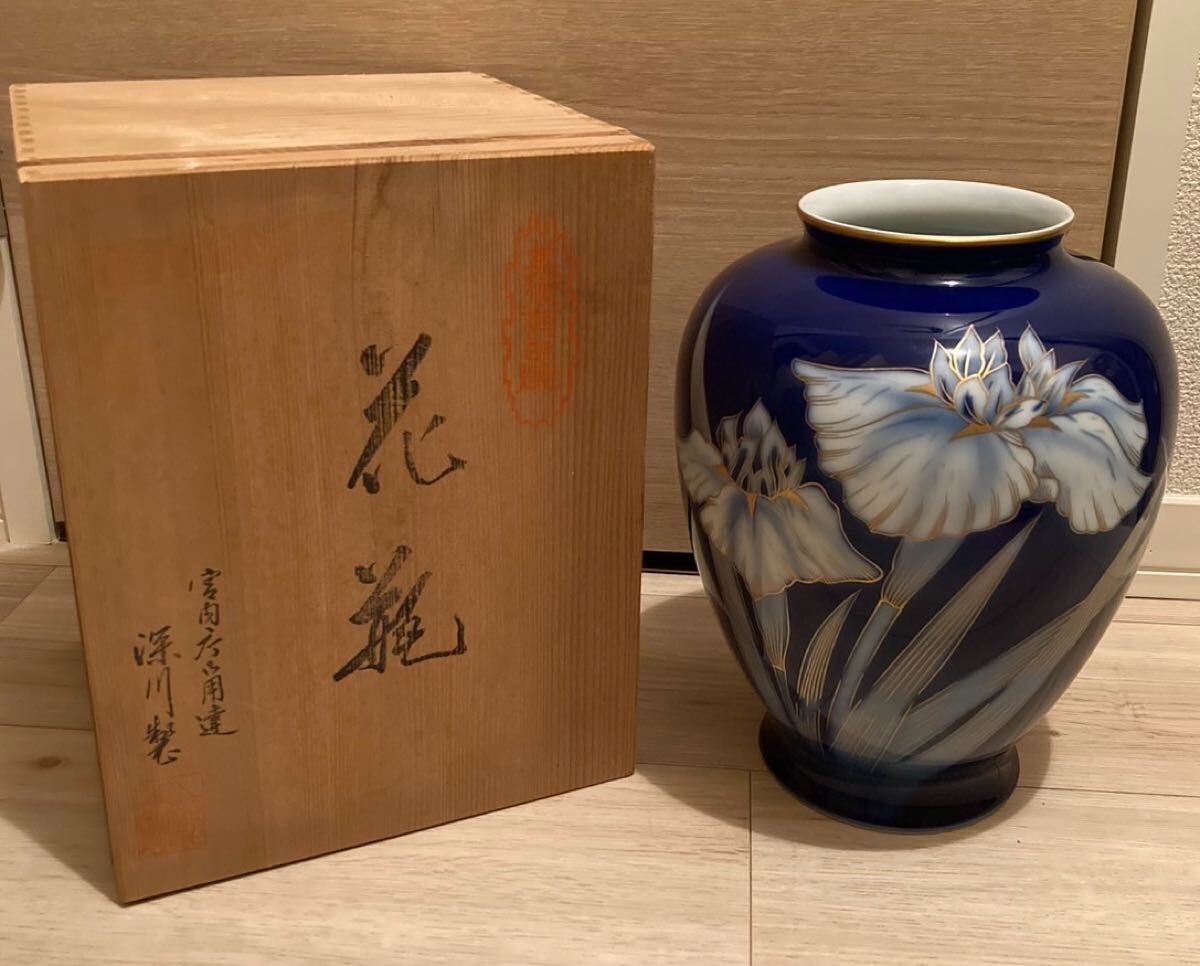 - △ 深川製磁 花瓶 花器 あやめ 宮内庁御用達 ブルー 金彩 菖蒲 共箱つき △282933