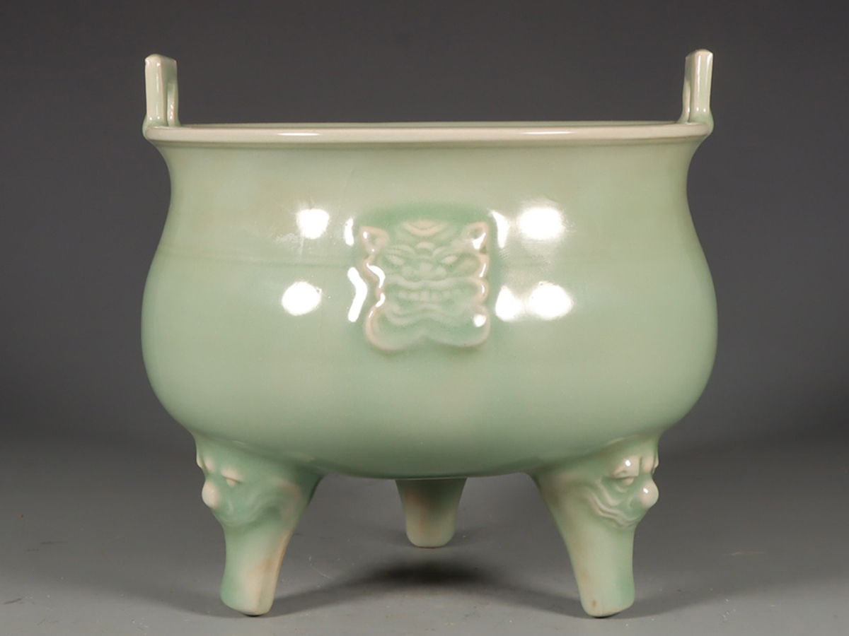 - ▽鴻▽宋時代 陶磁器 龍泉窯粉青釉三足炉 共箱 時代物 中国古美術 骨董品
