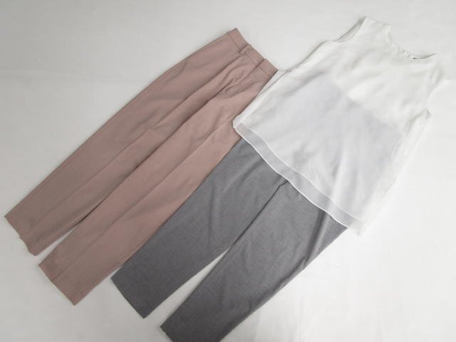 - 美品 UNIQLO ノースリーブPOブラウス+テーパードパンツ2点 ユニクロコーデ3点セット S相当 白/ピンク/グレー系 キレカジ系 20代~30代