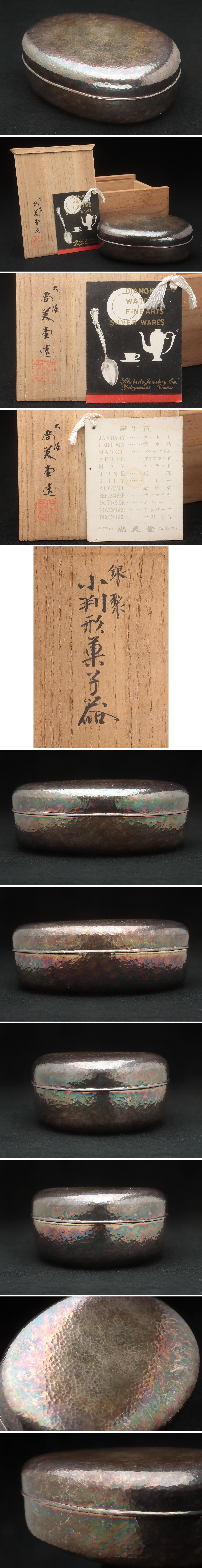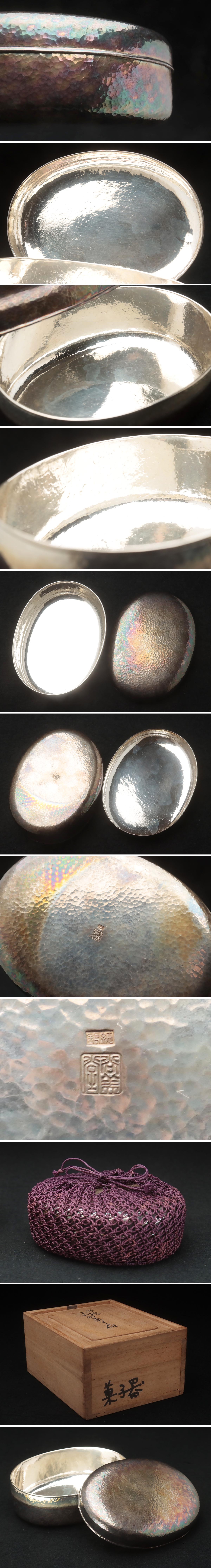 > FD224 【尚美堂造】純銀 長円形ヤンポ・銀鎚目 小判形菓子器 幅12.1cm 重124g 純銀刻 共箱附・ボンボニエール 茶道具