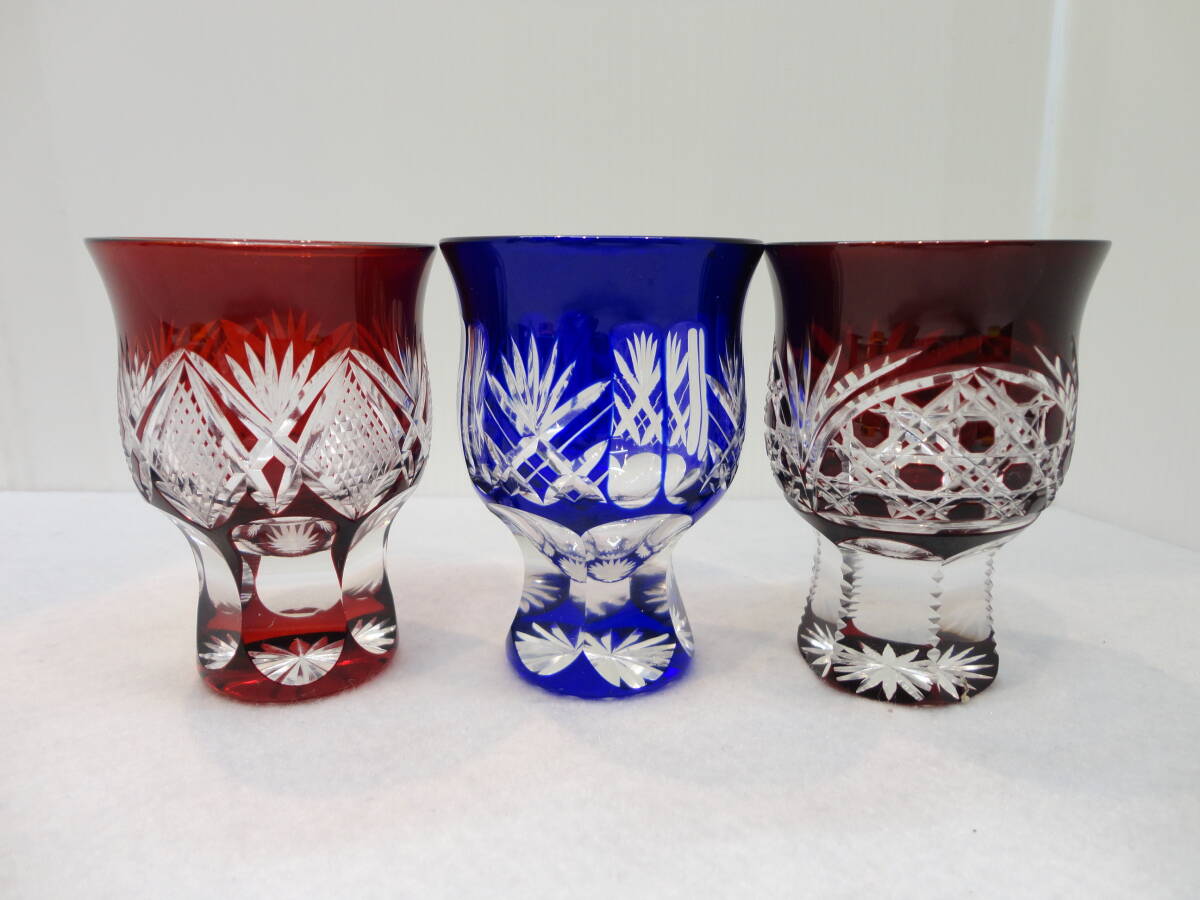 - 11726 伝統工芸品祭 廣田硝子 広田 ガラス ヒロタ 切子 赤 青 レッド ブルー 保管品 高杯 江戸 3個 色被せ