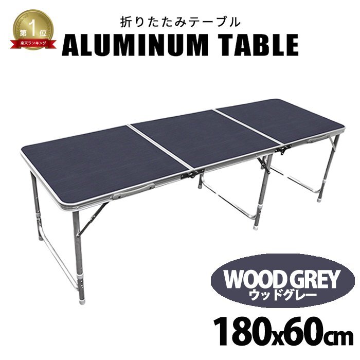 - 折りたたみ アルミアウトドア テーブル 180x60cm ウッドグレー キャンプテーブル軽量 脚 伸縮 高さ調節 キャンプ バーベキュー