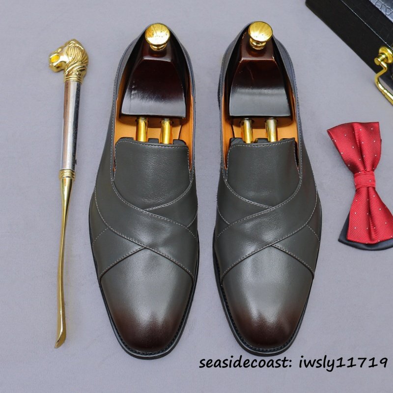 - 定価9万超■最高級 超希少 レザーシューズ 本革 ビジネスシューズ 職人手塗り上げ 彫り 牛革 紳士靴 革靴 フォーマル 新品 グレー 26.0cm