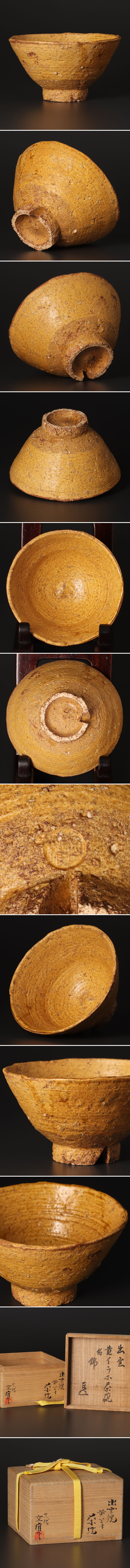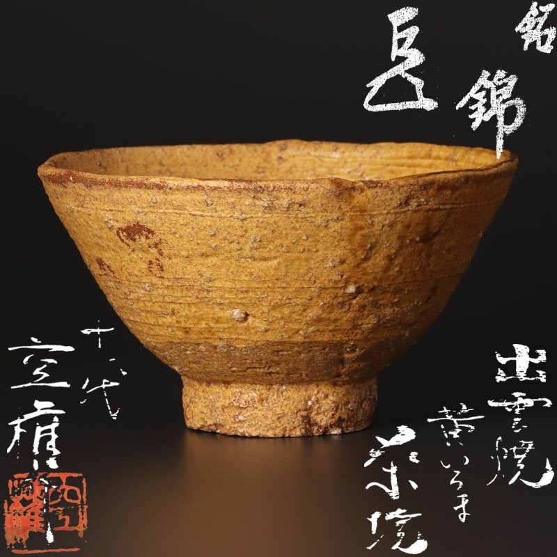 > 【古美味】十一代長岡空権(住右衛門)作『而妙斎書付』出雲焼 黄伊羅保茶碗 銘:錦 茶道具 保証品 DWq4